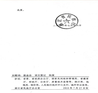 4.2010年7月,省民政厅签发《浙民民复(2010)48号》文件批准登记(附照2)和颁发《温州中学教育发展基金会》法人登记证书。
